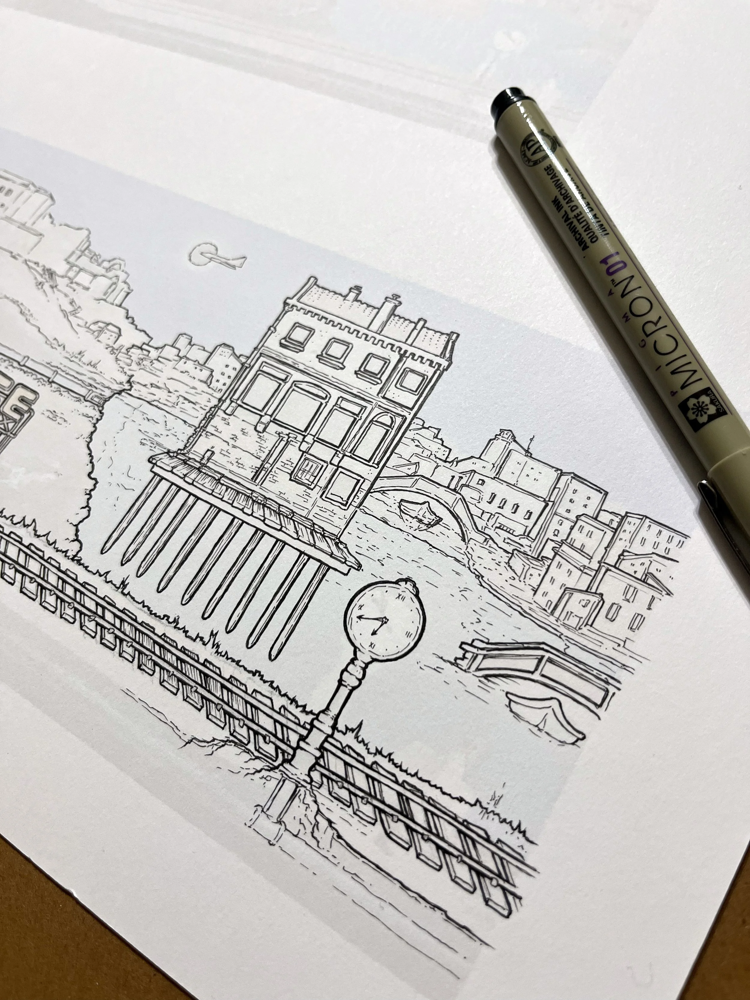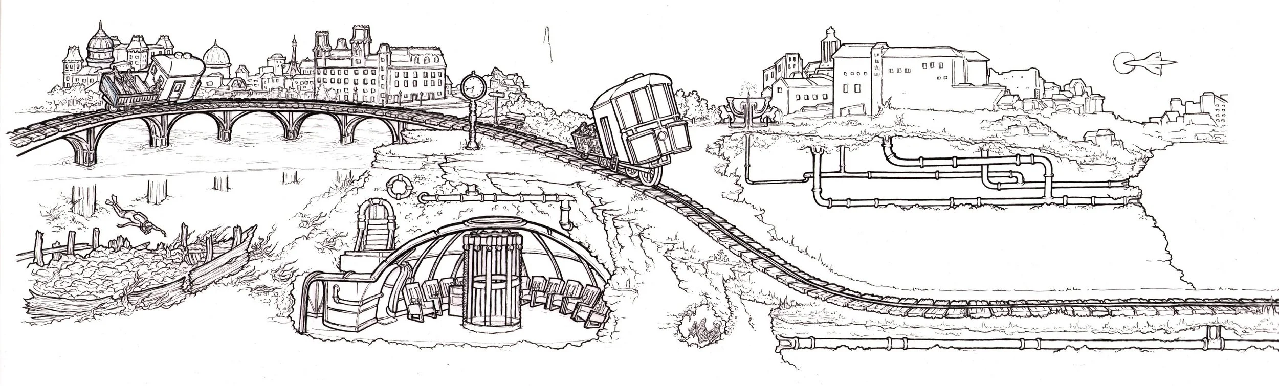 With the hard part over, now comes the fun part: inking! I printed my sketch out at a low opacity, inked the linework, and scanned it in.